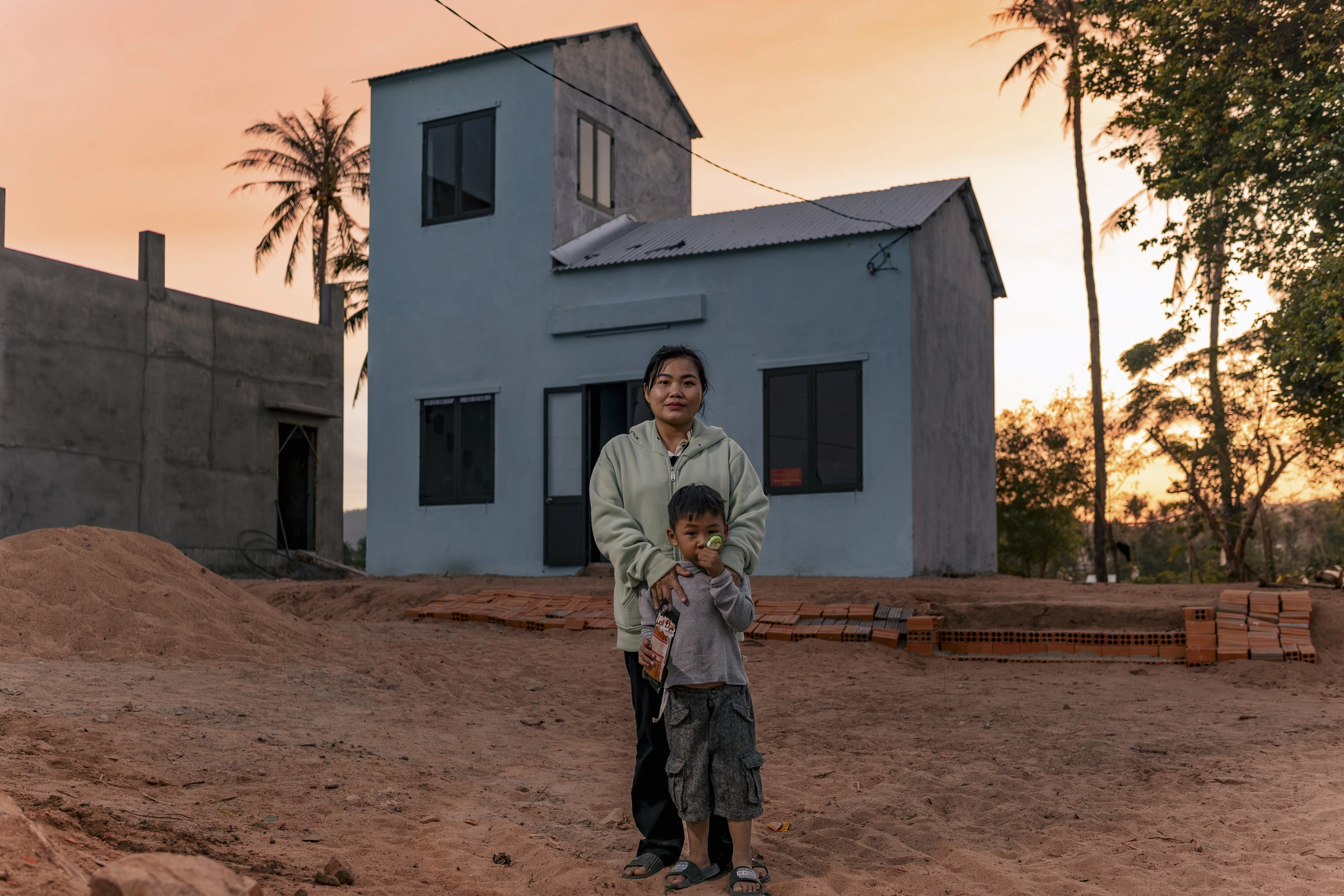 Chị Hồ Thị Ngọc Trân (30 tuổi, thôn Hà Yến, xã Tuy An Đông, Đăk Lăk) bên con trai trước căn nhà vừa dựng lại trong chiến dịch Quang Trung. Ảnh: Hoàng Việt