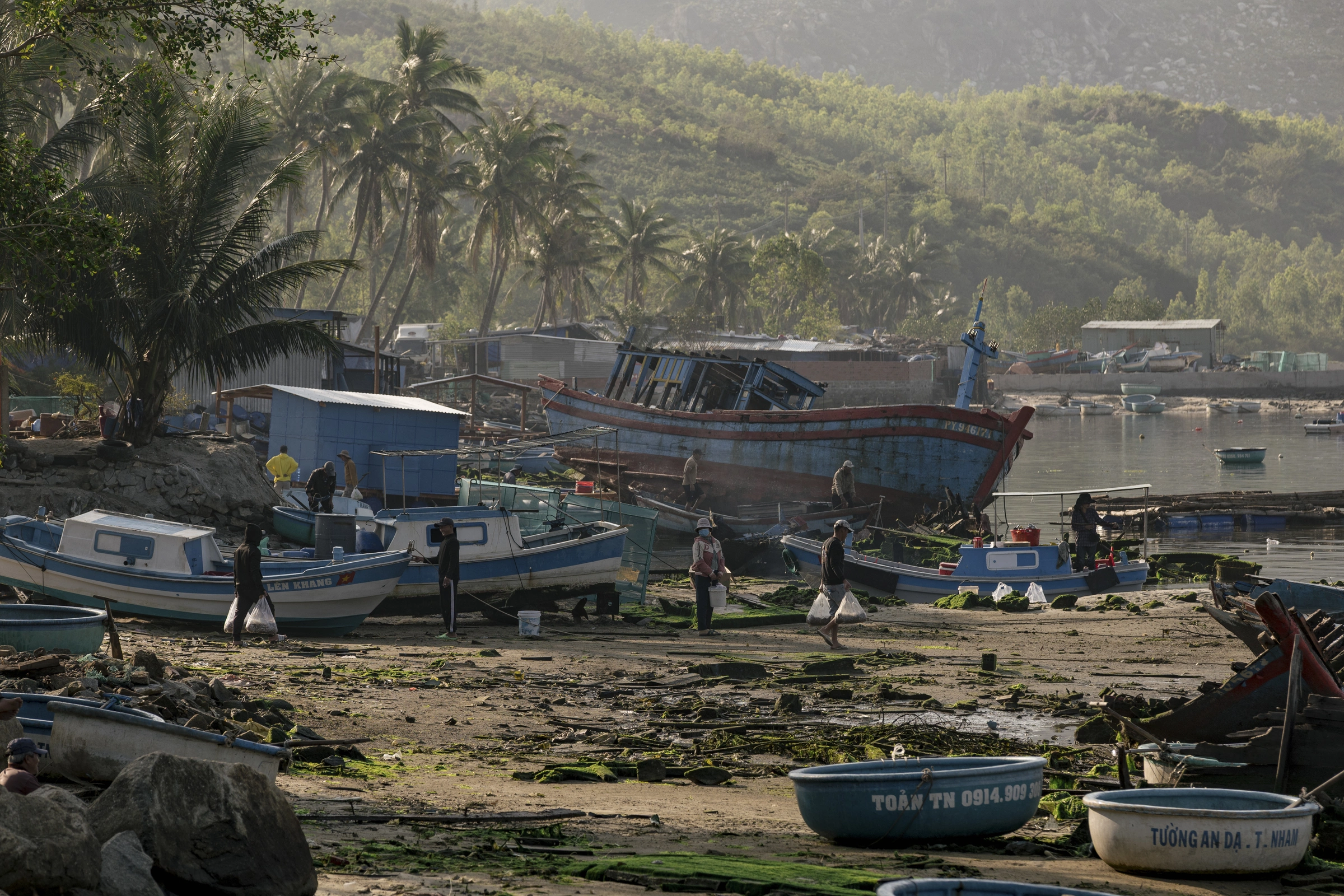 Sau bão lũ, việc sửa chữa "quá tải". Nhiều ghe xuồng nhựa vỡ nát, có chiếc lớn bị sóng đẩy dạt lên tận bờ, xác tàu hư hỏng phải chở bằng xe tải nhiều chuyến mới dọn hết.