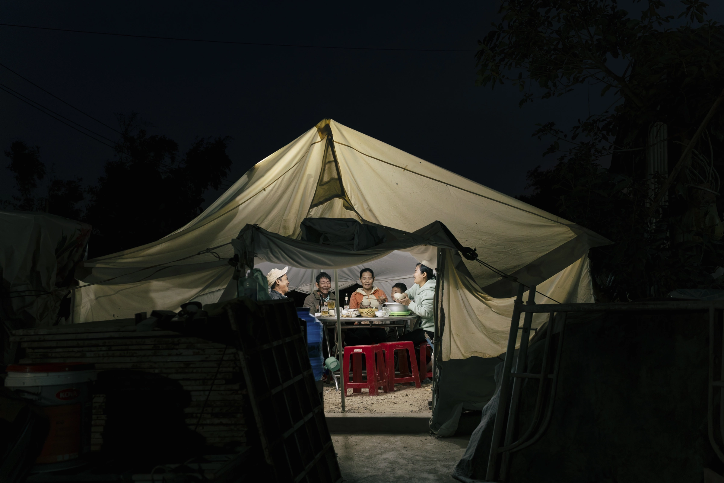 Bữa cơm của chị vẫn ở lều tạm được dựng sau lũ, cùng với ba mẹ. Cả nhà dùng chung một bếp còn sót lại, kê tạm trong chuồng bò, gạo chủ yếu nhờ các đoàn cứu trợ, chắt chiu từng bữa. Bao lúa trôi sạch, quanh xóm người ta đã bắt đầu cải tạo đất, gieo lại vụ, trồng hoa. Riêng gia đình chị lúc này chỉ dồn sức cho kịp có mái nhà trước Tết.