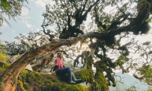 Khoảng một tiếng sau khi leo, trườn, bò và bám vào cây để đi, chúng tôi bắt đầu bước vào rừng nguyên sinh với những thân cây khổng lồ được rêu phủ kín, như đang lạc vào một thế giới huyền ảo. Sương mù che tầm mắt, cùng tiếng gió rít, làm cho khung cảnh càng thêm ma mị.