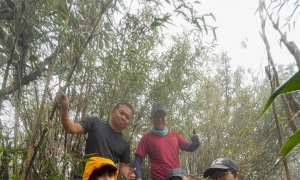 Nhiệt độ lúc này chỉ 5 - 7 độ C, gió mạnh nên chúng tôi tranh thủ chụp ảnh ở cột mốc rồi tiếp tục đường lên đỉnh Khang Su Văn cách đó khoảng 200 m. Đoạn từ cột mốc 79 lên đỉnh khá khó đi, phải xuyên qua rừng trúc rậm rạp. Nhiều lúc các porter đi trước phải dùng dao chặt cành cây mở đường. Sau khoảng 30 phút leo từ cột mốc 79, tức sau 4 tiếng 15 phút leo tính từ khu lán nghỉ, nhóm đầu tiên đã chạm tay vào chóp inox đặt trên đỉnh núi.