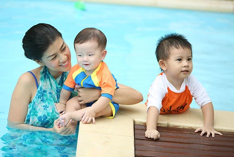Cậu con cả, tên ở nhà là Đôla, tỏ ra vô cùng thích thú khi được đùa giỡn với mẹ trong nước. |