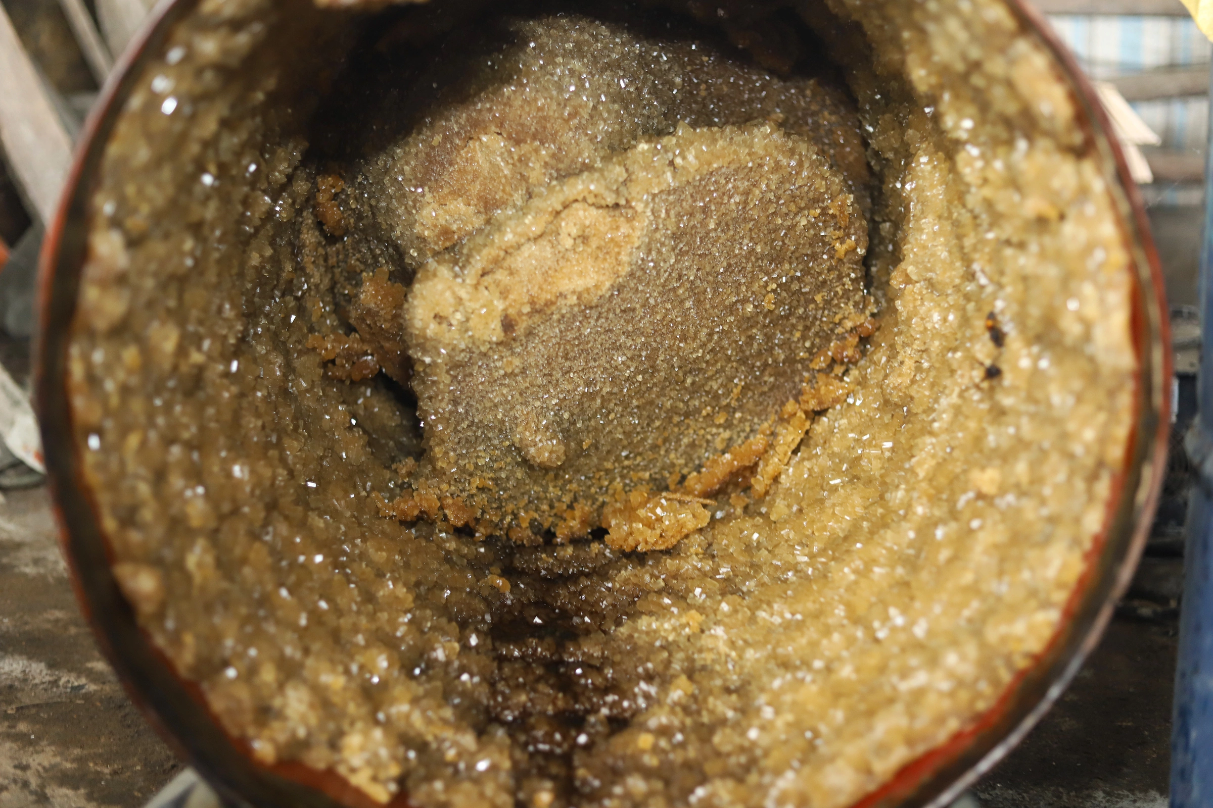 Mật được đổ vào chảo nấu trong khoảng một tiếng. Ở công đoạn này, vợ chồng anh Yên thay nhau đánh tan mật để tránh bị cháy. Anh Yên cho hay công đoạn nấu mật là quan trọng nhất. Thời gian cần được căn chuẩn, nếu sơ ý để mật cháy thì sẽ kém chất lượng.