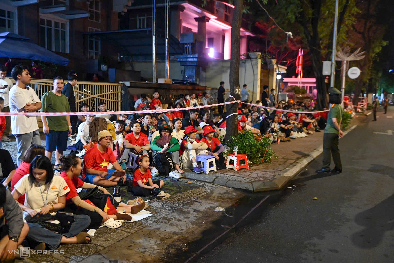 Lúc 2h, dọc vỉa hè đường Lê Lợi (quận 1), hàng nghìn người tập trung chờ xem tổng duyệt diễu binh, diễu hành. Do đây là đường có nhiều khối diễu binh đi qua, nhiều bạn trẻ đã tranh thủ đi từ 23h hôm trước, mang áo mưa, tấm nylon, đồ ăn, uống nước để ăn ngủ chờ.