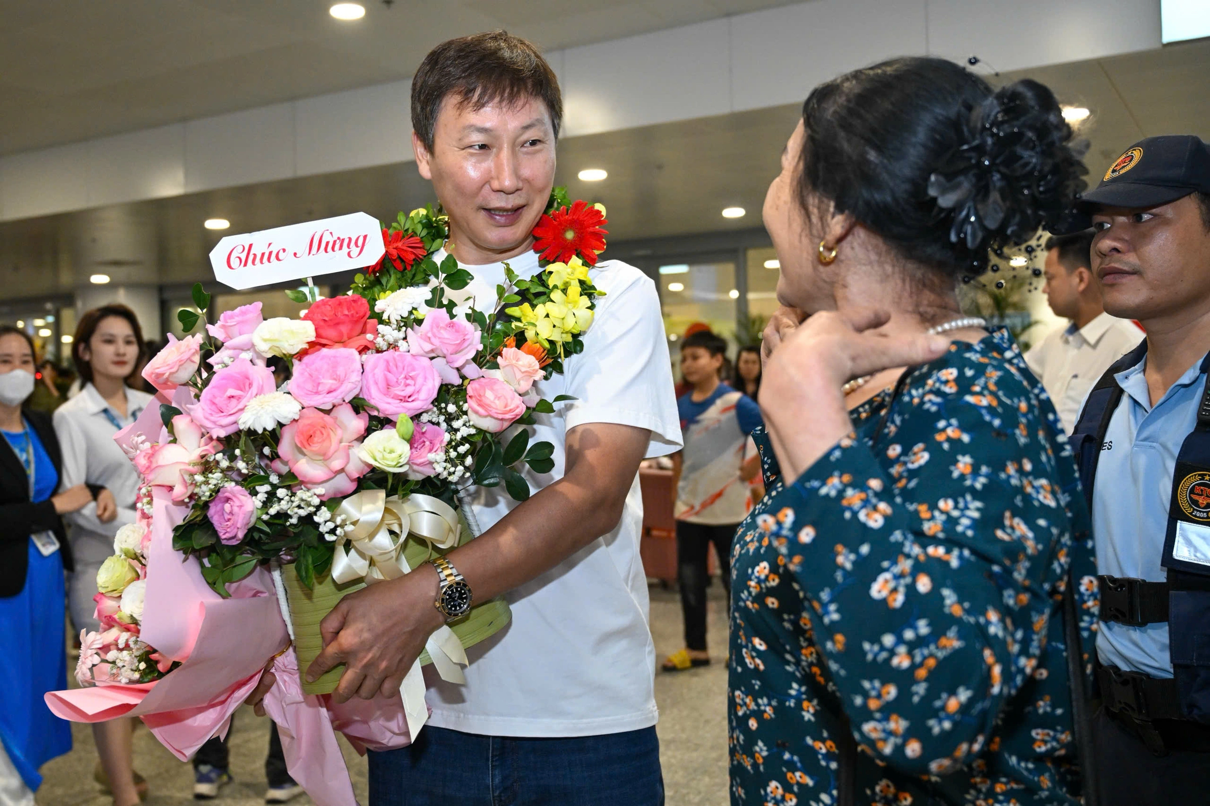 Sau khoảng hai giờ bay cùng 40 phút làm thủ tục, các cầu thủ ra đến sảnh chờ sân bay Nội Bài. Đại diện Cục Thể dục Thể thao và LĐBĐ Việt Nam (VFF) đã đứng chờ sẵn, đeo vòng hoa cho từng thành viên.