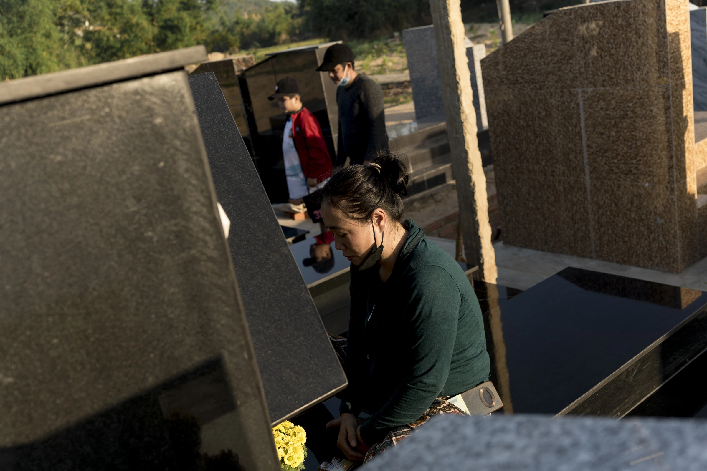 4h30 chiều, nắng phủ lên những ngôi mộ đá ở nghĩa trang nhà thờ Mằng Lăng, thôn Phú Thịnh (xã Tuy An Đông, Đăk Lăk) một lớp cam nhạt. Ba người ngồi trên ba mộ phần vừa xây, loay hoay phủi bụi trên di ảnh. Chị Lê Thị Kim Ngân (40 tuổi) mất chồng. Vợ chồng em ruột chị thì mất hai con vào tháng 11/2025.