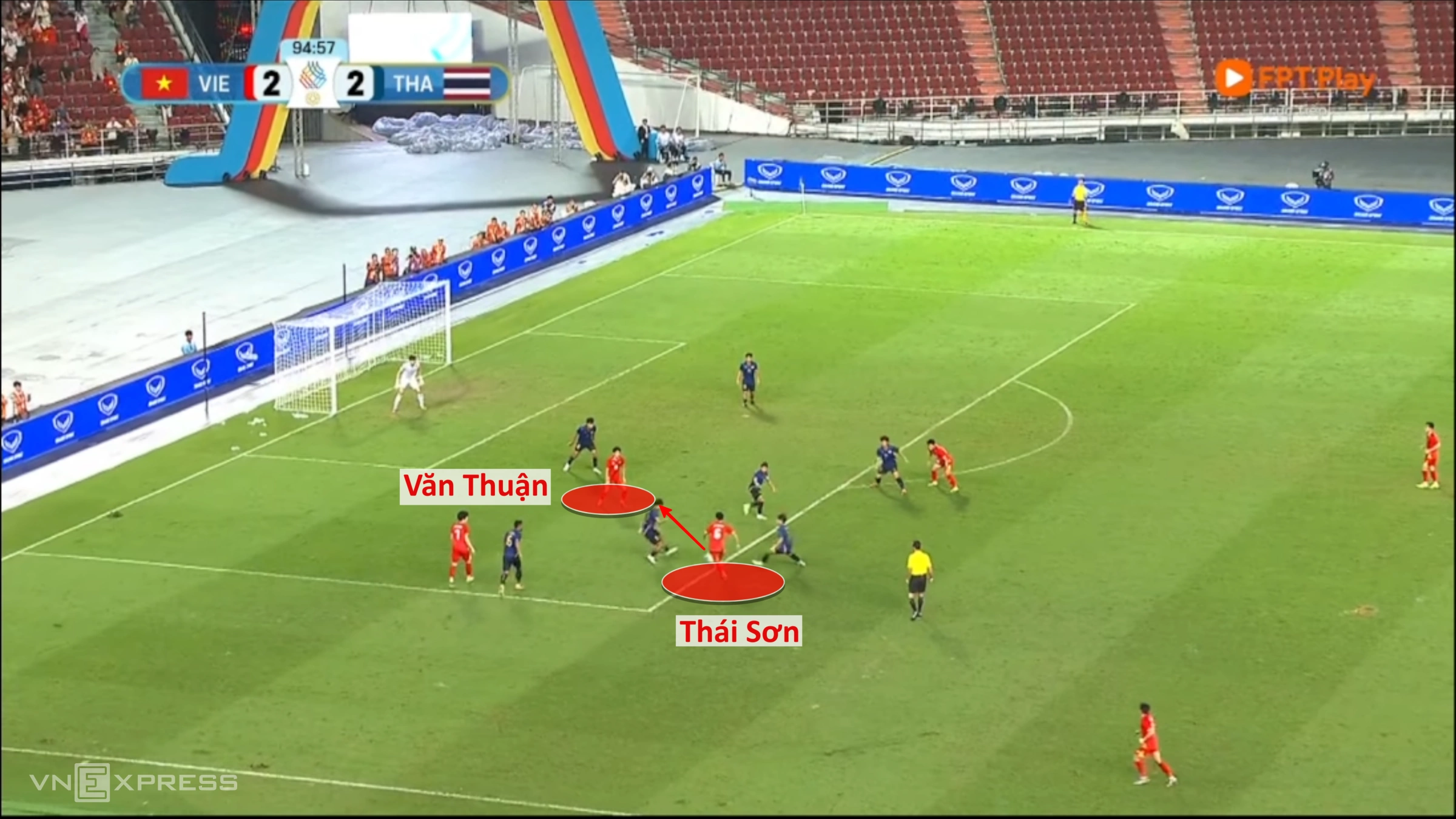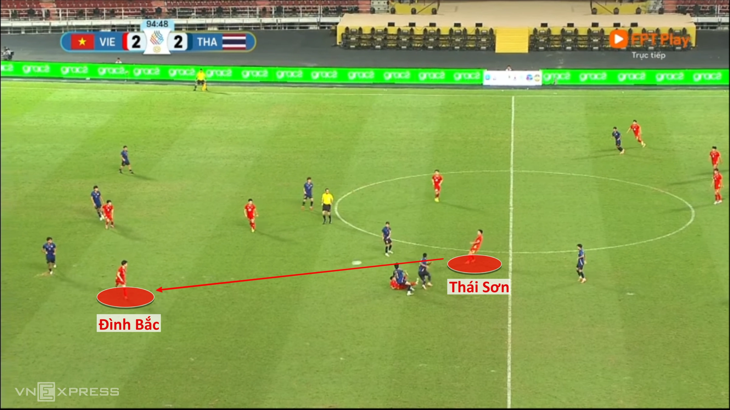 Việt Nam thu hồi bóng hai ngay trên phần sân đối thủ qua chân Thanh Nhàn, lập tức chuyển đổi trạng thái sang tấn công. Để rồi, Thái Sơn tung đường chọc khe cho Đình Bắc thoát xuống, đâm ra sau lưng hàng thủ Thái Lan đang chưa kịp thiết lập, dẫn tới tình huống penalty mở ra bàn rút ngắn tỷ số 1-2 do chính số 7 lập công.