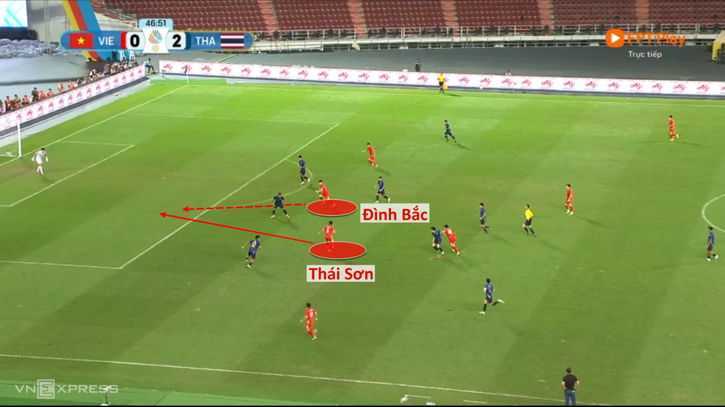 Với những đôi chân tươi mới, nguồn năng lượng được bơm vào khâu pressing tuyến đầu của đoàn quân áo đỏ. So sánh với hiệp một, Đình Bắc vẫn duy trì vị trí cao nhất trên hàng công khi không bóng. Nhưng ngay từ đầu hiệp hai anh đã liên tục di chuyển gây áp lực theo hướng vòng cung từ ngoài vào trong, nhằm vào các vị trí triển khai bóng từ tuyến thủ của Thái Lan.