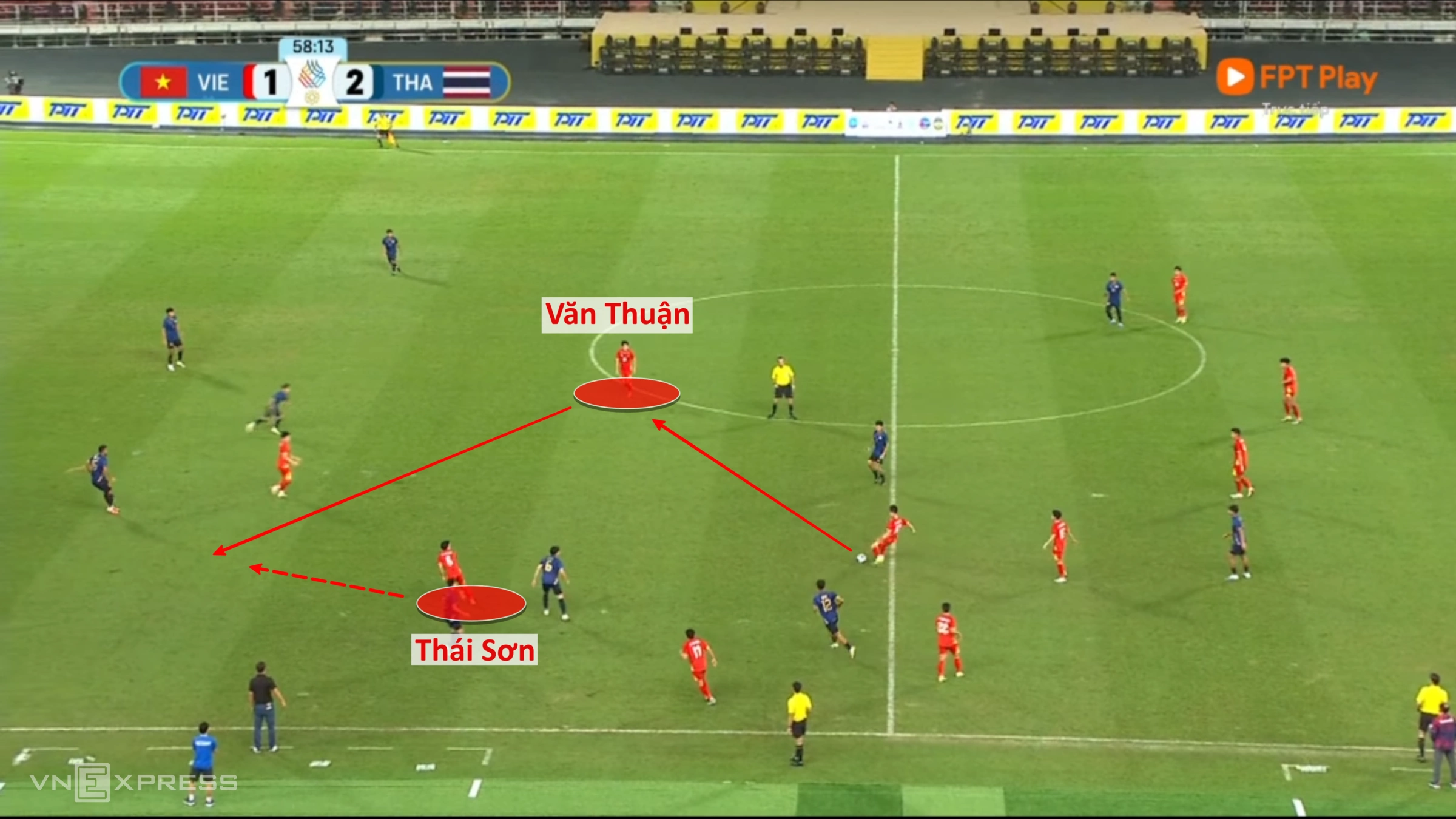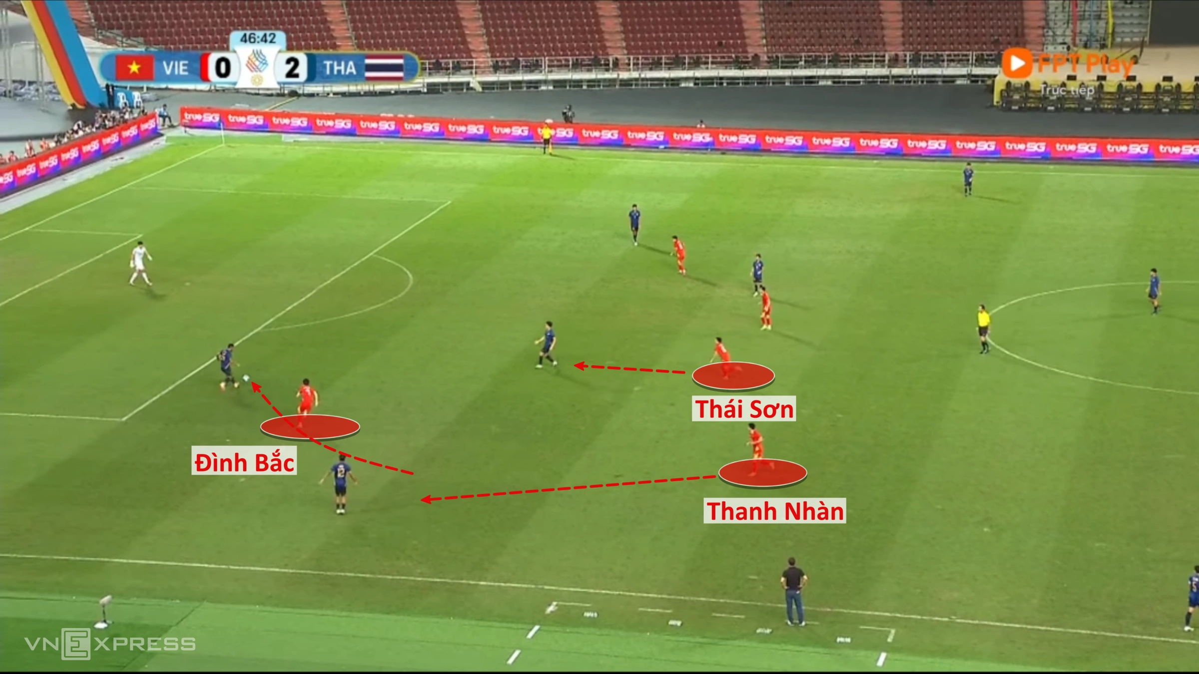 Những tình huống pressing kèm người chỉ diễn ra khi Thái Lan bắt đầu luân chuyển bóng ở hai biên. Nhưng đối thủ qua ba trận đấu trước đó cho thấy họ mạnh ở những tình huống ban bật, phối hợp nhóm biên với xu hướng các cầu thủ chơi gần bóng để dễ kết nối.