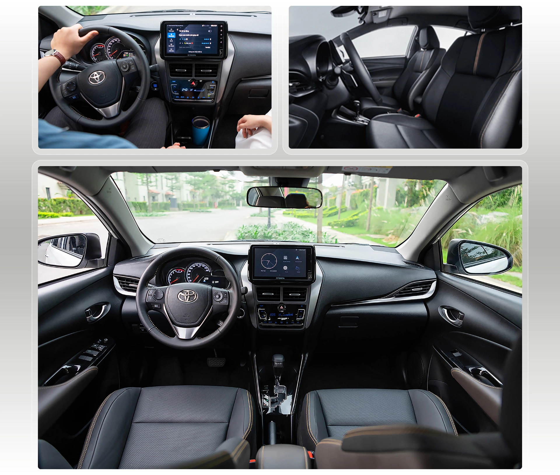 Ở bên trong cabin, không gian được tối ưu cho vị trí ngồi lái với tầm quan sát thoáng. Ở phiên bản mới, Vios có màn hình giải trí cảm ứng 9 inch, tích hợp các kết nối Apple CarPlay, Android Auto, Bluetooth, USB... Dàn âm thanh 6 loa có họa tiết mới. Giao diện, đồ họa của màn hình cũng bắt mắt và nhạy bén hơn trước đây. Thiết kế màn hình giải trí được đưa lên cao, tương tự xu hướng trên các mẫu xe mới nhất của Toyota Việt Nam. Màn hình trung tâm người lái dễ quan sát nhờ kết hợp đồng hồ cơ và màn hình LCD.